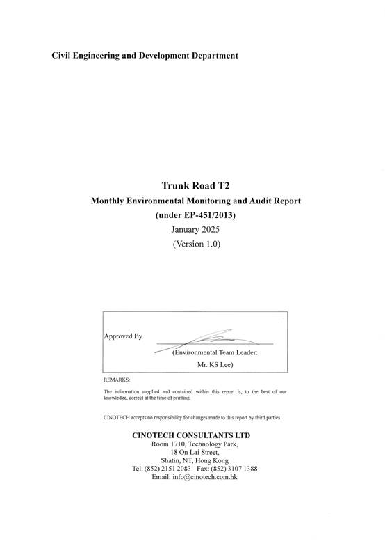 1. This is the 59th Environmental Monitoring and Audit (EM&A) Report prepared by the Environmental Team (ET), Cinotech Consultants Ltd., for “Trunk Road T2”. This report summarized the monitoring results and audits findings of the EM&A programme under the issued Environmental Permit (EP) No. EP-451/2013 and in accordance with the EM&A Manual (AEIAR-174/2013) during the reporting month of January 2025.